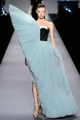 Tulle suits, tulle cocktail dresses and gowns with shirred, chopped up, out of control netting that seemed to defy gravity. Holes were cut out of tulle gowns as if a Haute Couture bullet had gone right through them--or a starving fashionista had taken hold! Other gowns were propped up by inner structures that supported the yards and yards of gathered tulle to create incredible silhouettes. The entire show looked EXPENSIVE--all that fabric, all that beading, the staging, the hiring of Roisin Murphy to sing at their show. I kept thinking how I rarely even see Viktor and Rolf clothing at stores (and I shop A LOT!), so how are they affording to stage such grand events? (I'm jealous!)
